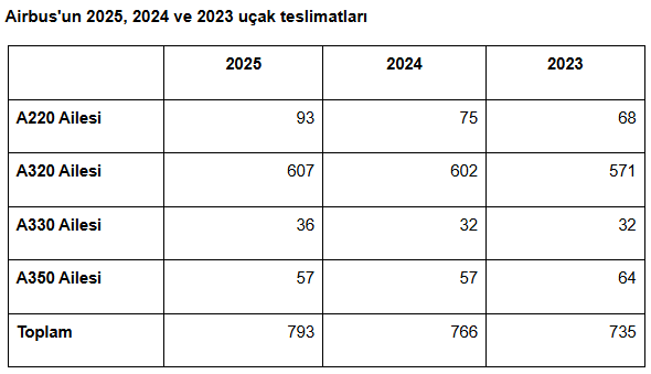 Airbus, 2025 yılında dünya çapında 91 müşteriye 793 ticari uçak teslim etti ve Ticari Uçak işinde 1.000 yeni brüt sipariş kaydetti. Aralık 2025 sonunda birikmiş uçuşlar, yıl sonu rekoru olan 8,75 adet 4 uçağa yükseldi ve bu da Airbus'un ürün portföyüne olan güçlü pazar talebini vurguladı.