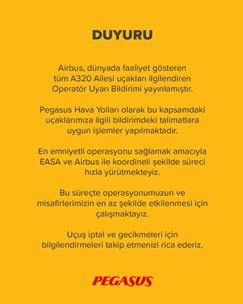 Pegasus Hava Yolları, Airbus'ın A320 tipi uçaklar için yayınladığı "Operatör Uyarı Bildirimi"nin ardından, meydana gelecek uçuş iptal ve gecikmelerle ilgili, yolcuların en az şekilde etkilenmesi için çalışıldığını duyurdu.