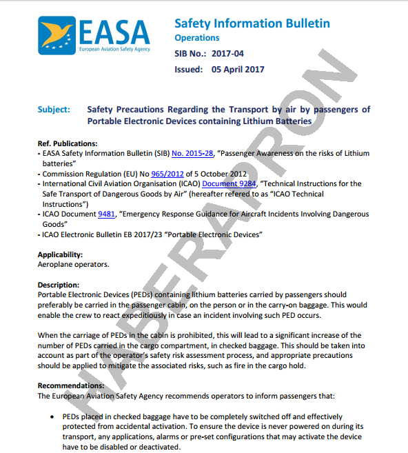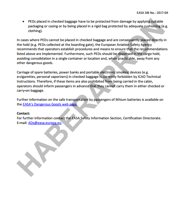 Bu duyuruya göre kargo bölümüne cihazlar toplu halde yada bir kutu içinde konulamayacak. Ayrıca yedek piller, güç bankaları ve elektronok sigaralar uçağa kesinlikle alınmayacak. 05 Nisan 2017 tarihli yayımlanan duyuruyu tam bir şokla karşılayan havayolu şirketleri daha önce başlattıkları uygulamayı tamamen rafa kaldıracağı ve yeni çareler üretmeye başladığı öğrenildi.