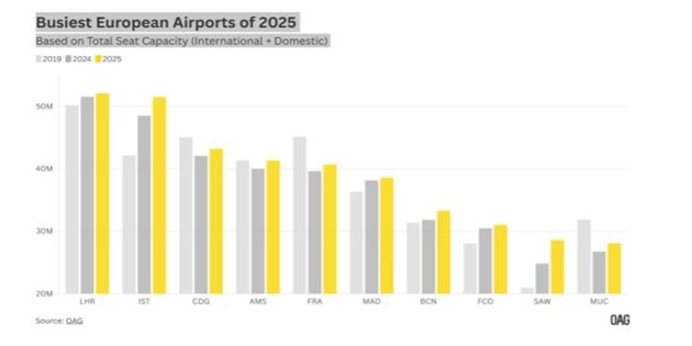 Havalimanlarını, arz edilen koltuk kapasitesi bazında derecelendiren OAG’ın “Avrupa’nın en büyük 10 havalimanı” değerlendirmesinde Sabiha Gökçen Havalimanı (SAW), 2025 yılında kapasitesini bir önceki yıla göre %15 artırarak 28,6 milyon tek yönlü (semi-route) koltuk kapasitesine ulaştı ve ilk 10 havalimanı arasında yıllık bazda en yüksek artışı kaydeden merkez oldu. Raporda Avrupa’nın önemli merkezlerinden Frankfurt (FRA) ve Münih (MUC) havalimanlarının, pandemi öncesi (2019) seviyelerinin hâlâ gerisinde kaldığı belirtildi. Her iki havalimanı da 2024 yılına kıyasla sırasıyla %3 ve %5 oranında toparlanma eğilimi sergilese de yıllık bazda %15 artış kaydeden Sabiha Gökçen Havalimanı, 10. sıraya gerileyen Münih’in önüne geçti. “Avrupa’nın en büyük 10 havalimanı” listesine giriş yapan tek yeni havalimanı İstanbul Sabiha Gökçen olurken 2024 yılında 11. sırada yer aldığı çalışmada iki basamak birden yükselerek dokuzuncu sıraya yerleşti.