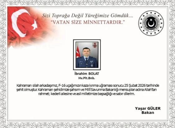 Tarih : 2026.02.25 14:51:04Şehit F-16 Pilotu İbrahim Bolat İzmir’de Defnedilecek