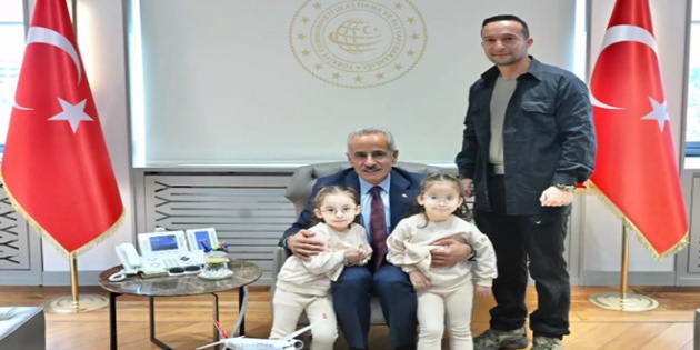 Ulaştırma ve Altyapı Bakanı Abdulkadir Uraloğlu, babalarıyla birlikte uçak inişlerini izlerken kaydedilen görüntüleriyle büyük beğeni toplayan ikiz kardeşler Erva ve Zümra’yı Ulaştırma ve Altyapı Bakanlığı’nda ağırladı.